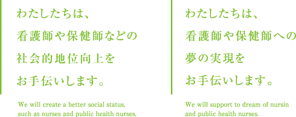 新しいコーポレートロゴは、明朝文字で品性とチカラ強さを、さらに円をモチーフにした文字の形は、あらゆる教材・発行物に「ひと工夫の独自性」を持った企業であることを表現しています。また、コーポレートカラーの緑は、成長する植物を表現しており、看護師や保健師のよりよい社会的地位を創造するという企業スローガンを示しています。